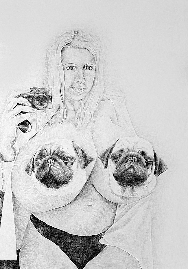 The German Speaking Project, which vastly enhanced RHEE’s German language speaking abilities and local socialization, reveals language as a necessary component of subject formation and professionalization while laying the groundwork for the artist’s future projects about German culture. RHEE’s Schicke Möpse (2015-2016), comprised of illustrations, designed T-shirts, and the related video I Love the Way I Look!, utilizes parody towards a feminist critique of preposterous beauty ideals. The project departs from the figure Beshine, a German model reported to have the largest fake breasts in the world. Each breast weighs approximately twenty pounds, about the size of a small dog. The German word for Pug, Mops, as RHEE observes, is often used as a euphemism for boob/tit/breast, so that “Schicke Möpse!” would be the equivalent of saying “Nice tits!” in English (RHEE Schicke Möpse). Taking this phrase and Beshine’s image as her starting points, RHEE’s project parodies the beauty ideals embodied in Schicke Möpse by subverting traditional artistic conventions, utilizing multiple modes of communication, and effectively translating between styles and media. The project began with sketches of Beshine, provocatively posed and smilin . The model’s gigantic, protruding breasts blossom into two pug faces. The drawings, executed with graphite on paper, resemble Renaissance preparatory sketches. Fine lines mimetically render the classical motif of human-animal hybrids, mimicking the longstanding Western art educational practice of drawing from live nude models. However, unlike the neoclassical reclining or contrapposto nude with downcast eyes prevalent during the Renaissance, RHEE depicts Beshine semi-clad in short-shorts or underwear and opened shirts, from side and front, looking confidently at the viewer.
