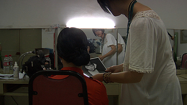 The second video depicts an all-Chinese cast and crew preparing for and shooting a soft-core pornography film starring actors playing Benjamin and Wong. The video begins with the Chinese actors being made up to look like Wong and Benjamin, recalling the old cinematic practice of “yellow face” (ubiquitous, like “black face”) and Hollywood’s correlating anti-miscegenation codes (aligned with state and federal laws). Wong frequently lost parts to white actresses, including, most painfully, the role of O-lan in Pearl Buck’s The Good Earth. O-lan, which Wong longed to play, was instead given to Luise Rainer, a German actress, who starred with the male lead, Wang, played by Austro-Hungarian-born American actor Paul Muni. One of Wong’s biographers, Graham Russell Gao Hodges, writes: